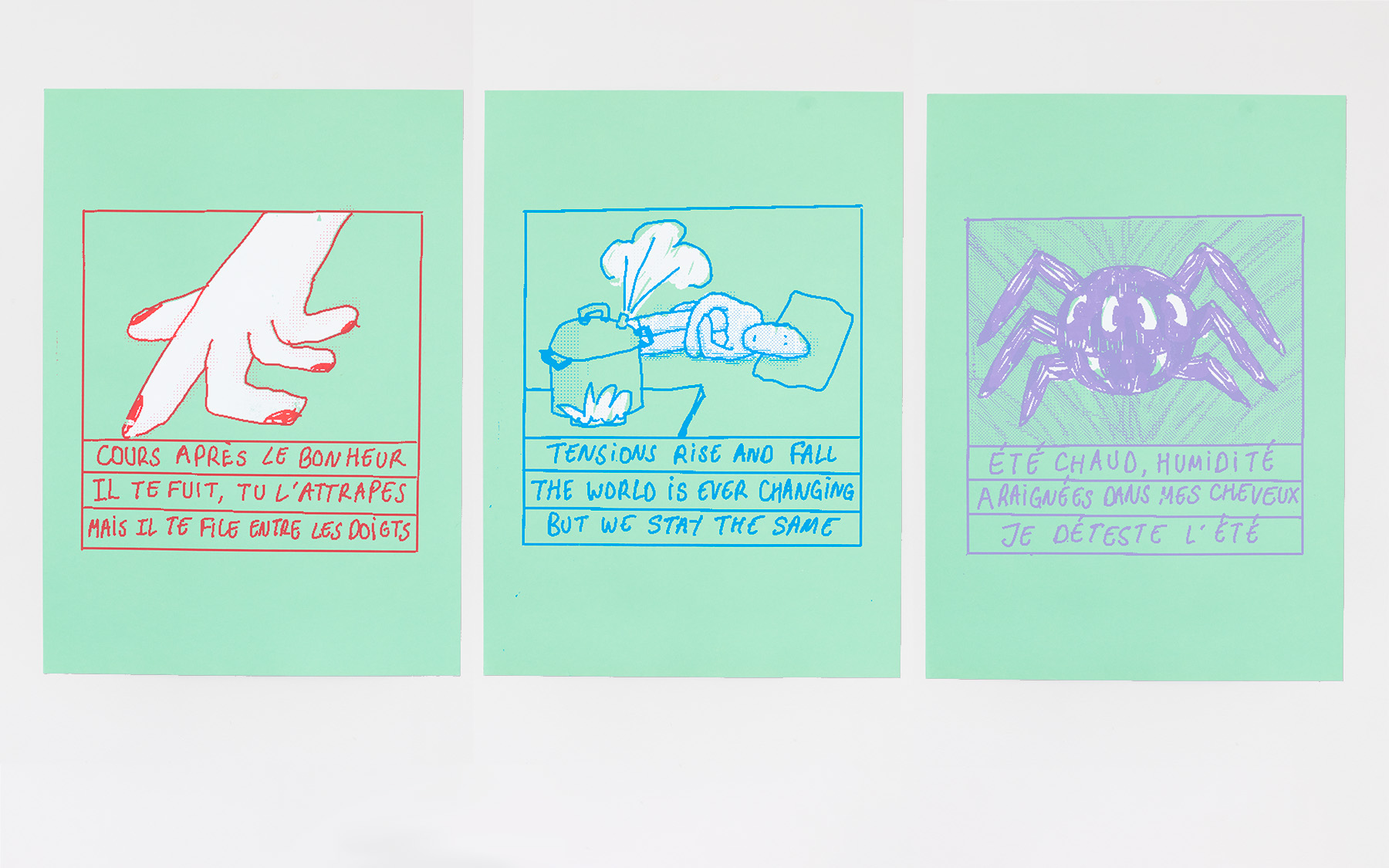 Un triptyque de sérigraphies y est exposé pour l’occasion. Elles découlent d’un jeu créatif avec une IA conversationnelle, au cours duquel il génére différents haïkus. Ce protocole artistique avec la machine inspire plusieurs illustrations qui sont ensuite sérigraphiées sur des grands formats.