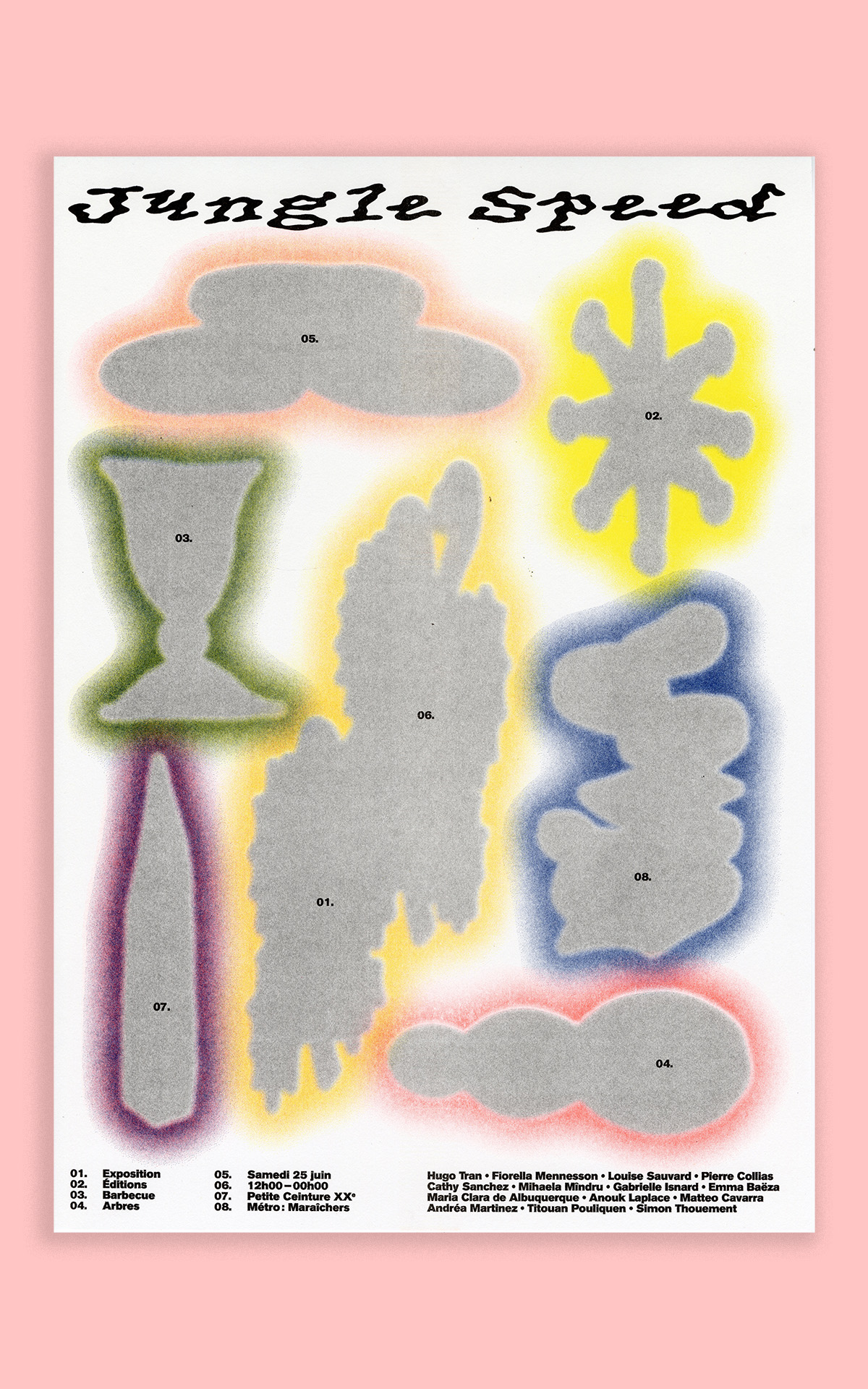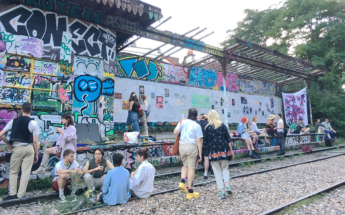 Organisation d’une exposition sauvage sur la petite ceinture avec 14 jeunes artistes. L’affiche de l’événement a été composée avec Titouan Pouliquen où, chacun à notre tour, nous choisissions une forme abstraite et son emplacement. L’idée d’un dialogue entre divers créateurs aux univers différents, rassemblés pour une après-midi de jeux.