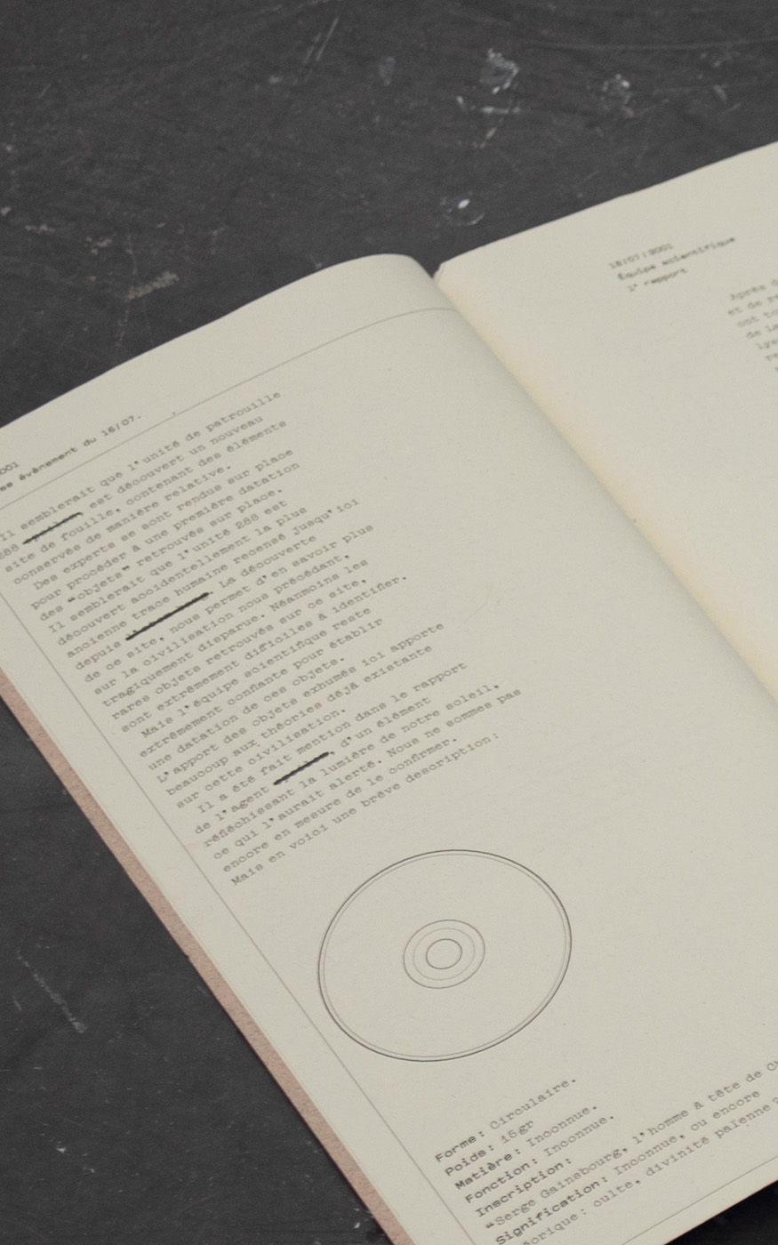 Ce projet est un récit de fiction raconté à travers une édition mêlant gravure (technique de transfert) et texte. Ce récit interroge le domaine de l’archéologie et sa capacité à raconter, à déterminer et interpréter une histoire à travers les traces matérielles du passé. En effet l’histoire prend place en l’an 3001, quand un agent d’entretien de la zone H, tombe miraculeusement sur ce qui fût autrefois semble t-il une habitation datant d’une civilisation reculée des années 2000 (l’ancien appartement de Matthieu, 8 rue des Anglaises, à Cambrai, 59400). Il s’agirait ici de la plus ancienne trace de civilisation retrouvée depuis l’Atom Bang, les équipes d’archéologues et de scientifiques vont alors commencer un travail de fouille et d’analyse, à partir des éléments et diverses traces retrouvés sur place. Cette étude mènera à la découverte d’une civilisation vivant aux alentours de 2098, se nourrissant exclusivement de chewing-gum, ayant comme monnaie des CD, et vénérant le dieu Picsou.