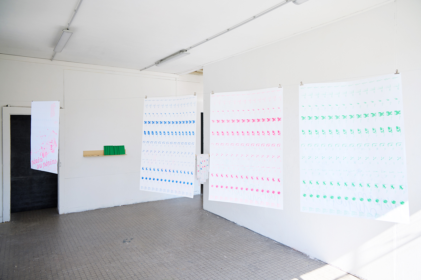 Élaboration de la communication de l’exposition étudiante pépin ou pépins à la galerie Quinconce à Montfort-sur-Meu, qui s’est déroulée du 11 avril au 18 mai 2024. L’affiche est pensée comme un gâteau ; malheureusement ce dernier semble avoir été dévoré rapidement, et nous ne pouvons percevoir que les restes sur cette affiche… L’idée est que chacun puisse repartir avec une part lors de l’exposition. Plusieurs parfums sont donc déclinés : myrtille, fraise et menthe, qui sont ensuite découpée en morceaux disponibles en libre accès (14 bandes par affiche) au dos desquels figurent le nom des exposants.